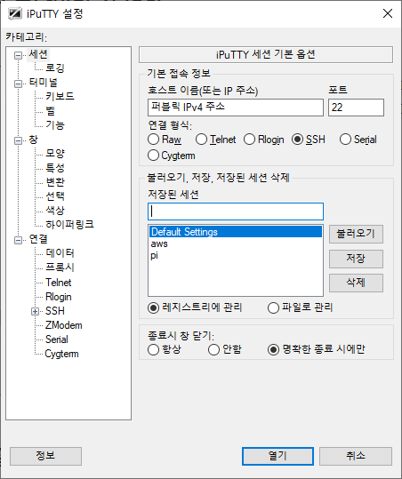 그리고 다시 세션 카테고리로 가서 저장된 세션 밑에 저장할 세션 이름을 입력하고 저장 열기까지하면 끝입니다.