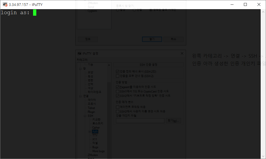 왼쪽 카테고리 -> 연결 -> SSH -> Auth 메뉴로 들어가서