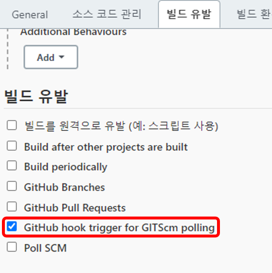 GitHub hook trigger for GITScm polling 항목을 체크해주세요