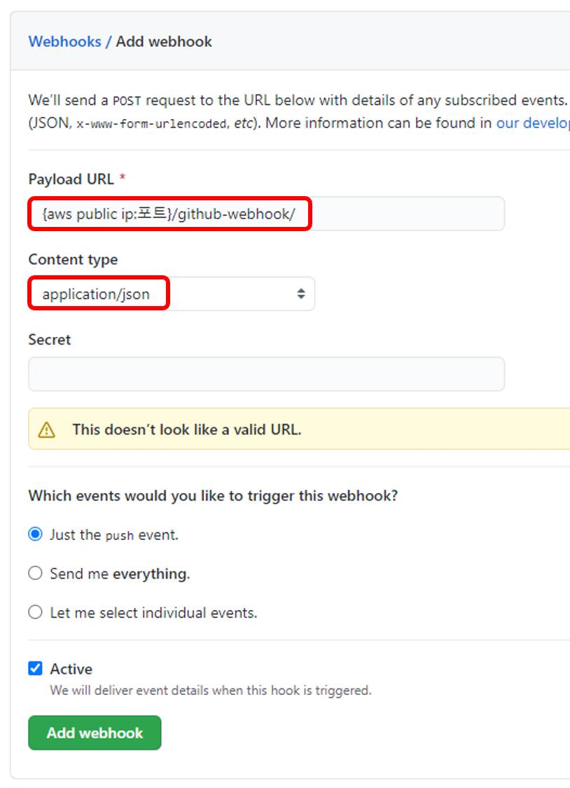 Payload URL : http://{aws public ip:포트}/github-webhook/