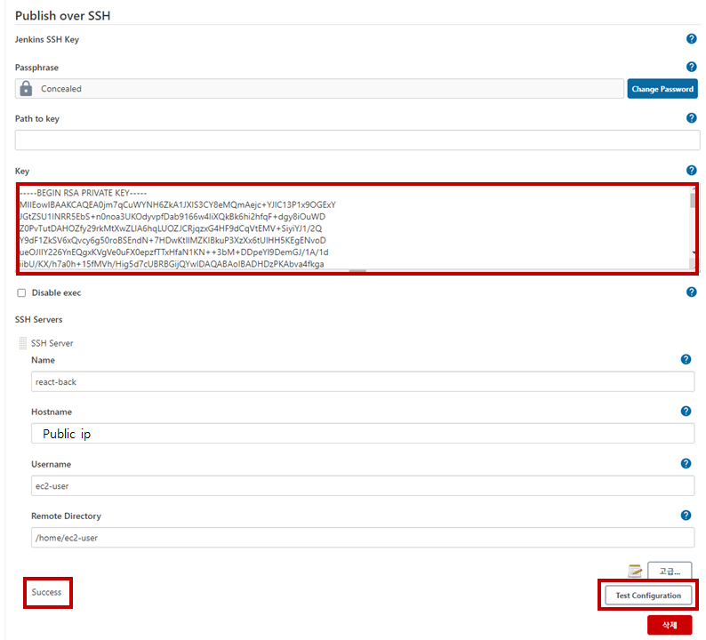 key : aws 인스턴스 접속할 때 쓰던 pem키의 내용을 적으시면 됩니다.