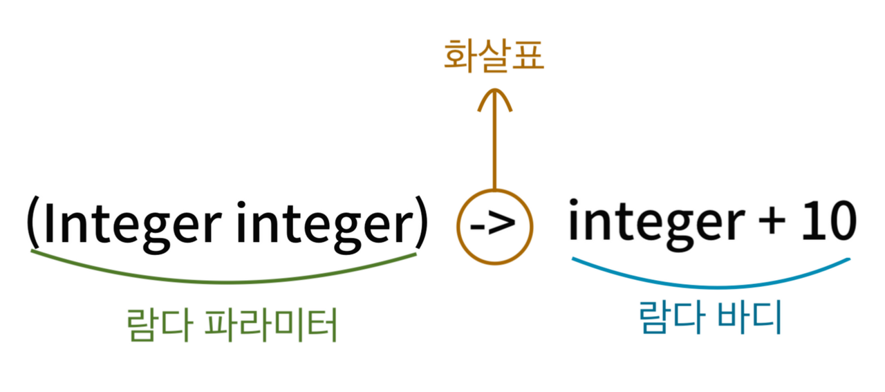 람다 표현식에는 이름은 없지만, 파라미터 리스트, 바디, 반환 형식, 발생할 수 있는 예외 리스트는 가질 수 있다.