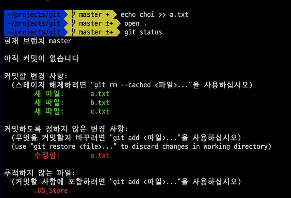 커밋할 준비 된 new file: a.txt라고 표시가 됩니다.